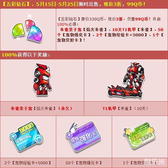 5月15日-5月25日期间,【五彩钻石】原价330Q币,现价3折,仅售99Q币!开启100%必得:朱雀亲子宠【焰火朱雀】、10天T1机甲【朱雀】、50个【宠物强化卡】、2个【宠物经验卡+5000】、1个【宠物变形卡】!千万不要错过哦!
