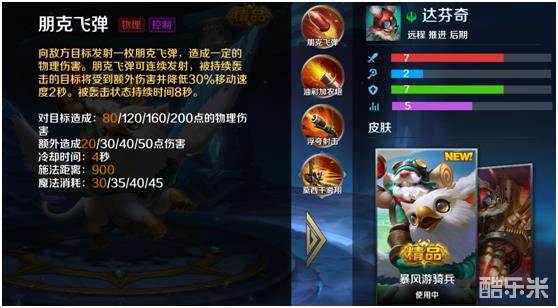 一技能朋克飞弹,对目标造成80/120/160/200物理伤害。8秒内命中同一目标2次可减速30%持续2秒并且每次普攻造成额外物理伤害,冷却时间4秒,耗蓝30/35/40/45,施法距离900