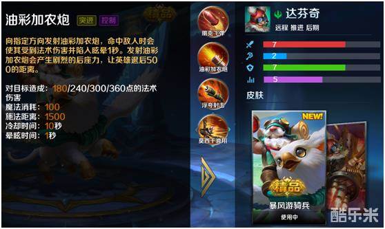 二技能油彩加农炮,对命中的敌人造成满级300法术伤害并晕眩1秒,冷却10秒,耗蓝100.