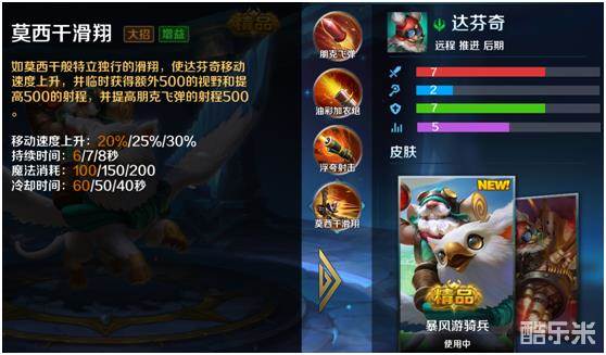 终极技能莫西干滑翔,开启后增加20%/25%/30%移速,持续6/7/8秒,冷却时间60/50/40秒。开启后增加达芬奇500射程,并且提升一技能500射程。