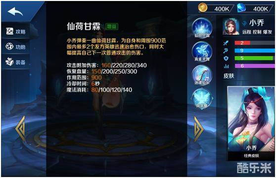 一技能仙荷甘霖,治疗自身及900码范围内两名受伤的英雄,并且提升下一次普攻伤害,冷却时间仅6秒,能提升伤害的持续时间也为6秒,等于说只要时间卡的好,可以释放一次仙荷甘霖后等待5秒,再攻击敌方英雄,一秒后立刻再释放再平A,配合其他小乔技能,能够出其不意轻松击杀。