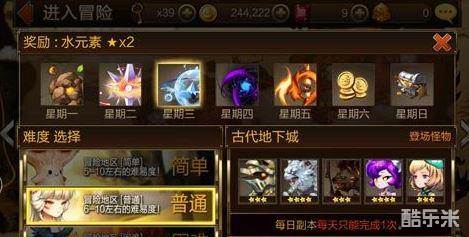 挑战失败了不会损失什么,但是成功了能得到高一星的元素英雄。就算失败了,大不了对普通难度副本进行挑战,再不行就挑战简单难度副本。普通难度副本怪物组成的团队是这样的,三个3星和两个4星,星级不变,但是每天登场的怪物会不一样。