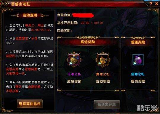 活动期间每根龙柱在第一次开启时,开启的血盟盟主或长老可以额外获得血盟奖励,该奖励不限次数。