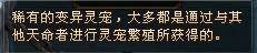 任何事物都有变异,灵宠也不例外,目前灵宠变异的方式只有和其他玩家的灵宠繁殖从而获得新的灵宠,而繁殖的灵宠很有可能是一只变异的灵宠。