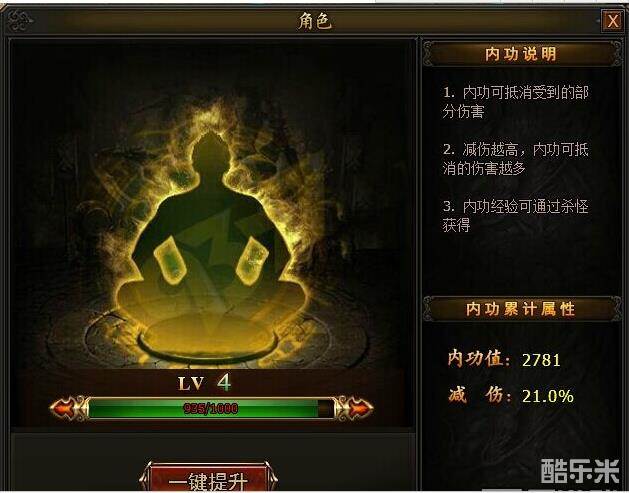 内功系统,所谓外练筋骨皮、内练一口气,内功是游戏中的一个独特的发展系统,在游戏中也有很多人关注这个玩法,无一不是浴血王城的强者,我们内功高了之后,我们在PK的时候受到的伤害是按减伤的百分比减下去之后的数值进行伤害的,大家可以感受的到我们受到的伤害数值,所以我们在游戏中晚上看到那么多人挂机,他们不是练级,因为高级打低级的怪,获取不了多少经验,大家都是在挂内功值,建议大家去玛雅神殿、BOSS挂机,那的怪物数量多,而且还能够给我们爆点装备,拿去回收再好不过。