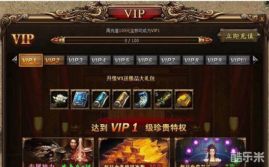 玩家首次充值达到100元宝,就可以成为VIP,享受众多特权福利。