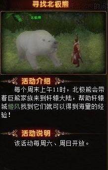 今天小编要告诉大家,北极熊副本任务,具体的介绍流程以及坐标,我们可以在轩辕城的职业神殿传送区域附近找到NPC姬风处接受【北极熊的考验】任务。在那你就能看到了。下面是小编为大家准备的图文资料,一起看看吧!