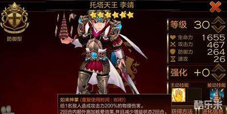 李靖唯一的技能如来神掌:给一名敌人照成200%的物理伤害,并且眩晕2回合,推进2回合,大家看到这个技能估计不会陌生了。因为这个技能和路迪的士兵突击除了相差了30%的伤害以外就是完全相同的技能,所以相信大家对这个技能的效果也并不陌生,参照路迪的单体就可以,而且CD方面也合路迪完全一样,80秒的CD,相对这个效果来说算是比较短的了。眩晕可以让对方一个敌人熄火,要是晕到了比较关键的敌人会有不错的效果,而两回合的推进可以有效对抗现在的各种僵尸流,顺便还可以清理一下各种免疫的被动。
