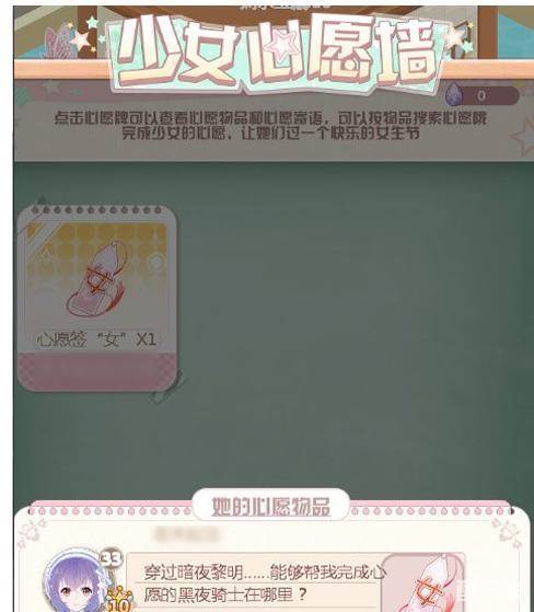 第一步,观察妹子的喜好。女生节期间,花语学园会在图书馆设立心愿牌,每个女生都可以在心愿牌上留上自己的喜好。然后等待一个骑士默默帮自己实现心愿。这个时候,你要做的就是浏览心愿牌上的心愿,然后开始第二步。