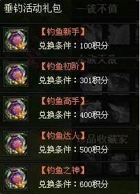 目测这个游戏的垂钓能获得的东西不少,,按照提示板来看至少有十多种,而且除了每个物品有积分以外,还可以通过完成收集来获得三个额外的礼包。而最后的积分礼包也是以最大的拿,比如你现在是590分,那么你可以领取的是钓鱼达人的礼包,但是再掉10分,你可以领取的就是钓鱼之神礼包了。