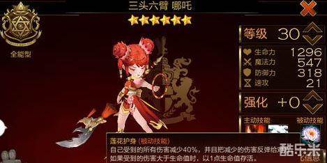 主动2:给2名敌人造成250%魔法伤害,附暴击。这个250%必爆就相当于塞恩的单体2连击吧,这个比例很高了,具体可参考死神的单体技能有多高。由于哪吒本身是全能型,所以速攻值并不高,但是其他三围相对都很高,由于被动的存在,他的配装可参考龙骑(格挡+反击或者反击+血,或者双反击),武器的话双速(个人偏爱速度,其实速+弱也行)首饰宝石爆伤或者吸血都行。