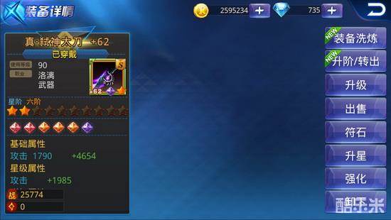 打开装备的详情界面以后,我们可以看到在右边的一竖排功能按钮中,上面第二个显示的是“升阶/转出”功能。转出功能相信大家已经比较了解了,对于更换过主要装备的玩家来说,转出当前装备的属性当然是必不可少的一个步骤。如果再次从1级开始升级升星的话,又是一大笔支出,而且是无意义的浪费,所以要把当前装备的属性转移至新的装备上去。那么既然装备的升阶是和转出在一块的,这两者有什么联系呢,大家接着看。