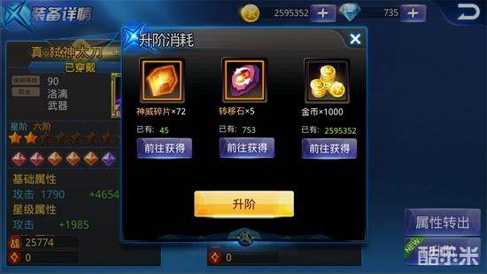 有了神威武器以后,我们就要回到转移功能上来,把当前的装备属性转移至新兑换的神威武器上,通过消耗转移石和金币来完成。然后我们当前装备的这把橙色武器就没用了,只能卖到商店获得一点橙色碎片的回馈,而且在卖的时候有亏损,也就是说你的武器如果是用100橙色碎片换的,那么卖到商店肯定比这个数值要小。但是现在推出这个升阶功能以后,等于节省了一个环节,我们不需要用两把武器转来转去,只需要消耗一定数量的材料之后,就可以获得全新品质的装备,而且当前的升级升星属性会完全保存,不仅方便,而且划算。大家可以回顾一下橙色装备升阶至神威装备所需的神威碎片数量,绝对比你直接兑换神威装备要便宜很多,这才是装备升阶的真实意义。但是装备转移也有它的用处,如果我们通过其他途径直接获得了高品质装备的话,当前装备就肯定要进行一次属性转出操作,所以保留转出按钮还是很有必要的。