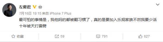 左雾在比赛结束后在微博留言:最可怕的事情是,我他妈的都被翻习惯了,真的是要加入乐观家族不然我要少活十年被天打雷劈。