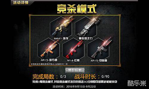 话说,最近几天,玩竞杀模式还有福利可领取。9月15日-9月22日,完成3局竞杀模式并且时长达90分钟可领取极品主武器一把。对了,进去死10次再出来可不能算一局哦。中途退出了还请再进去继续打,直到整局竞杀模式时间结束,双方胜负揭晓为止。