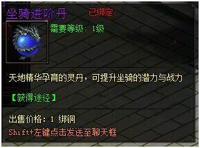 进阶所需材料:坐骑进阶丹,是低阶坐骑进阶到高阶坐骑的必备材料