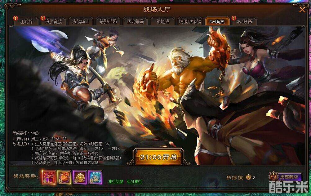 最后编辑于7年前玩家等级达到50级或以上,便可参加2V4竞技活动。这项活动每周三、五21:00-21:30的时间段开放,前提是开服1周以上,才开启2V4竞技的玩法。玩家进入跨服准备区报名匹配,每隔30秒匹配一次,匹配的玩家会被分成为两方进行战斗,一方2人,另一方为4人,每方共有5条命,先损失5条命的一方视为失败。
