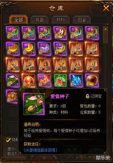 玩家要获得一些爱情种子,可完成每天的战无不胜爱情试炼副本,这个副本会产出大量爱情种子道具。玩家平时多做做日常任务、帮会任务收集一些藏宝图,然后开启这些藏宝图有一定机会获得一些爱情种子奖励,那就要看看你的人品如何啦。