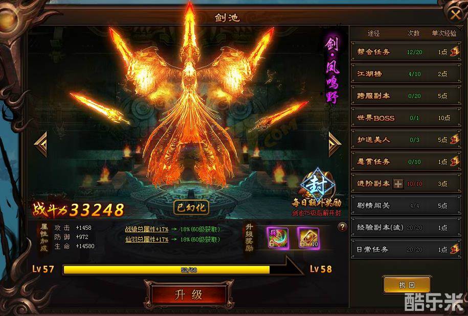 玩家要升级剑池等级,就要玩着剑池界面右侧的任务,逐个去完成获取一些剑池经验值,当剑池经验值达到升级要求,大家点击“升级”按钮,就能升级当前的剑池等级。当剑池等级得到提升后,大家能获得更强的剑池属性加成,这些属性主要有攻击、防御、生命。