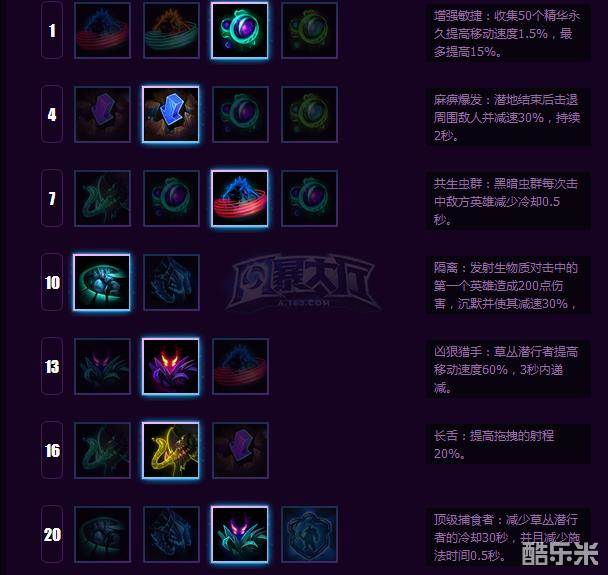 第六层:推荐长舌,提高Q的20%射程,20%看起来好像不长,其实这短短20%提高的Q命中率不是一点两点,十分的实用,这个天赋适用于绝大多数的情况。其他天赋的话,第一个麻痹酵素,Q完之后目标减速50%,持续两秒,减速效果很明显,增强留人能力,防止秒不掉的情况出现。同样不错,至于第三个天赋,急速再生,E钻地的时候恢复生命值,这个天赋看起来很美,在16级的时候恢复569,看起来很多的样子,20级则是恢复666,真的看起来很多,而事实上呢,16级德哈卡的血量是4562,20级血量是5338,说白了,这个E回血,只能恢复自身12%的血量,而到游戏里血条的直观表现那就更短了,只有短短的一截,而德哈卡自身并没有很好的防御能力,这点血量对他来说,其实并没什么用,只有配合他满50%D的时候,才会显得比较好用一些,而且E只有两秒,因此性价比并不算高,不如其他的天赋。