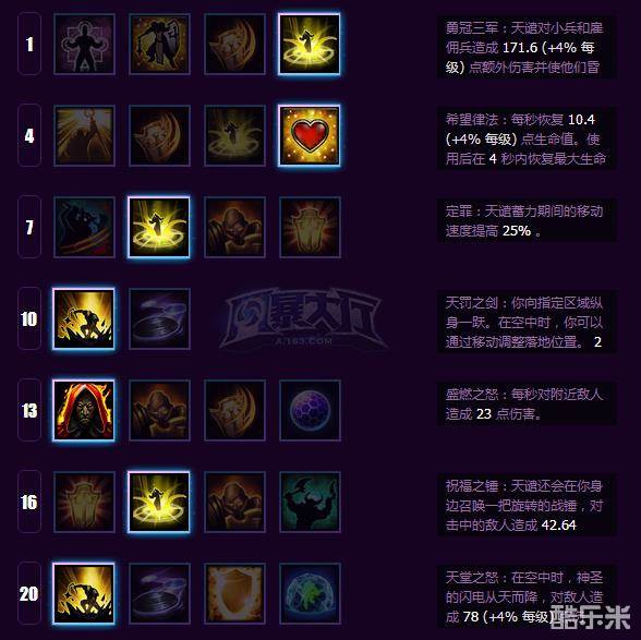20级强化大招 ,科普时间到,别被天赋介绍骗了!你以为是78(+4%每级)点伤害每秒?不,天罚的圈里的闪电每秒是造成多次伤害的,但是上限好像是击中3个单位,强化天罚20级打满对圈里的每个单位都能造成1550左右的伤害,换句话说强不强化大招差了1000点伤害。所以基本那种没位移的后期后排吃一套技能差不多就快挂了。