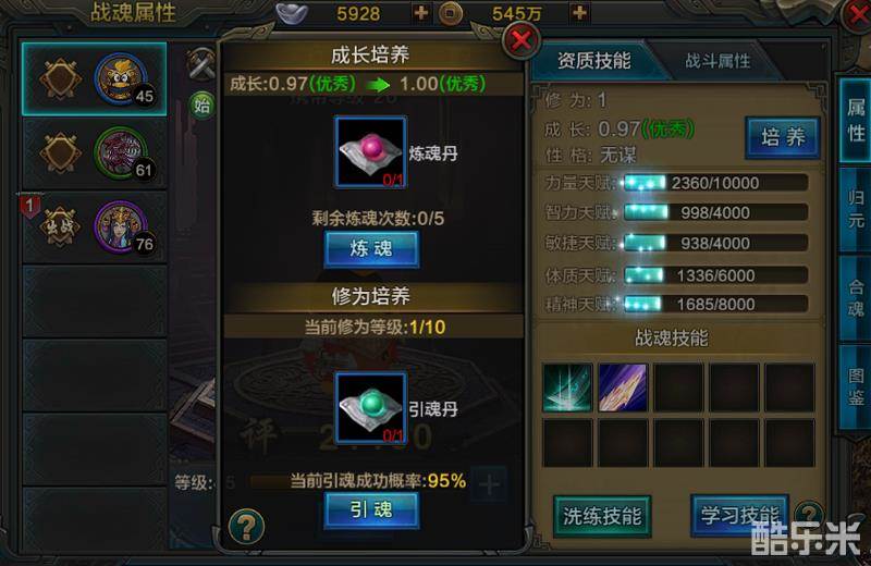 第三步:在合魂后,始魂将消失且无法恢复,获得的劫魂将继承己方始魂的性格和修为。劫魂从低到高有1-7个不同的变异等级,变异等级越高,战魂的天赋越高。