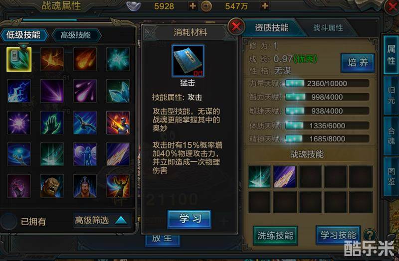 战魂的成长决定着它的后期成长线,战魂的成长分为“普通、优秀、杰出、卓越、完美、史诗”六种品质,成长值越高战魂升级时的属性加点越多,如杰出的战魂每升一级所得到的属性加点会比优秀的战魂得到的属性加点多;而卓越高于杰出、完美高于卓越、史诗级最高,不同成长品阶的战魂到后期所拉开的属性差距是非常大的。大家可以先通过归元重置成长值,如果对战魂的基础属性不满意,还可通过炼魂提升成长属性。