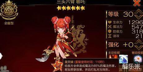 第二个技能为混天绫,对敌方群体造成85%的魔法伤害,附带贯通,并且会打乱对方阵型,这里的打乱阵型指的是对方在阵型不变的前提下,随机重新站位,并不能更换对方的阵型。而85%的五人贯通使得他又有法系小杰伯的称号,但是比起杰伯的100%贯穿虽然只少了15%的伤害,CD却有110秒,单纯从作为输出上来看还是比杰伯差了点,不过打乱阵型有时候会有奇效,有他的存在竞技场又欢乐了不少。