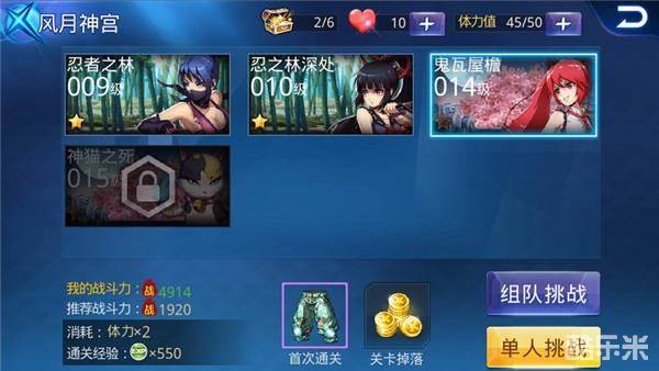 鬼瓦屋檐的进入等级从前一个关卡的10级直接飙升至14级,而且首次通关也会奖励一件10级的紫色装备,这次给的是裤子。单单从推荐战斗力这里来说呢,鬼瓦屋檐的提升貌似也不是很大,前一个关卡是1600,这里是1900。虽然在数据上只提升了300的战力,但是实际中可绝对不止这些。