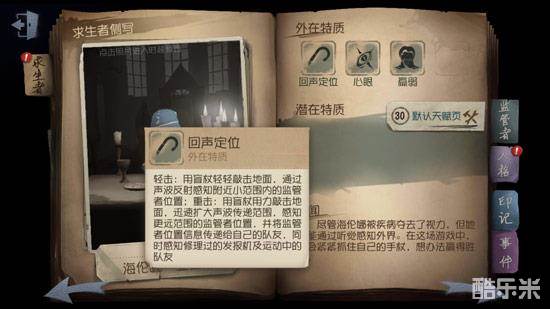 轻击:用盲杖轻轻敲击地面。通过声波反射感知附近小范围内的监管者位置;重击:用盲杖用力敲击地面,迅速扩大声波传递范围。全图感知监管者位置,并将监管者位置信息传递给队友,同时感知修理过的发报机及运动中的队友。