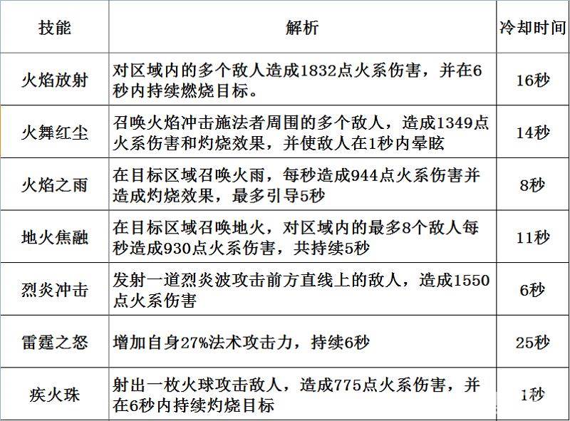 刷怪,不管是在端游还是手游,一直都是法师的主场,谁让咱们群攻技能多呢。个人推荐的刷怪技能键位设置为:火焰放射+火舞红尘+火焰之雨+地火焦融+烈炎冲击+雷霆之怒+疾火珠。下图附上每个技能的效果以及冷却时间,可以看出,刷怪技能主要是群攻技能和带持续灼烧效果的技能,每一个技能都能长时间的造成伤害。