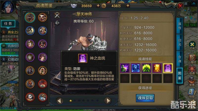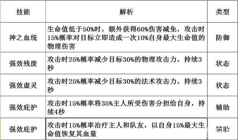 在战魂选择上,角色在80级以前,崩龙、双翅金乌等随便用用就好,毕竟升级速度太快,到80级时就可以好好培养一只战魂了。法师选择战魂主要看战魂的天赋属性以及战魂技能,个人建议优先选择擎天神将,其次七星魔君和天尊。因为擎天神将不仅体质天赋高达16000,最重要的是它的技能。如下图可见,除了可减少敌人的攻击力外,更有神之血统这种强势攻击的技能,配合法师高额的输出力,简直是绝配。