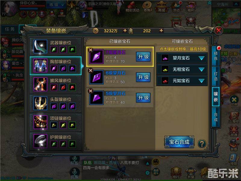 游戏中拥有北斗、天行、望月、无相、元如五种宝石,镶嵌宝石还可增加装备的镶嵌属性。诅咒系暗巫的武器、戒指、护腕攻击类部位的装备,主要镶嵌天行宝石,提高法术攻击;胸部、头盔、项链、护腿防御类装备可镶嵌望月以及无相宝石,加强物理以及法术防御;而披风、腰带、鞋子只能镶嵌元如宝石,增加生命值上限。