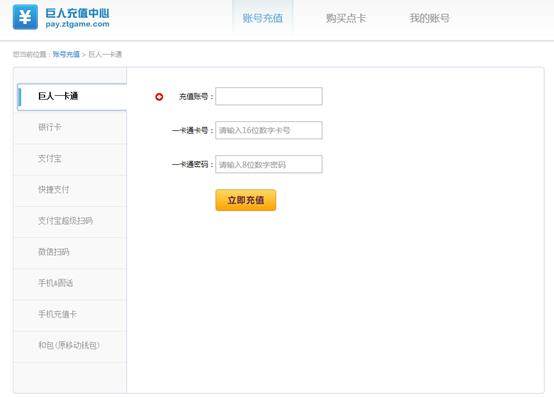 当您购买了游戏点卡或卡密后,如图所示,在页面输入您的游戏帐号,然后填入您所购买的游戏点卡或卡密的充值卡号,再输入游戏点卡或卡密的充值密码,点击“立即充值”即可。