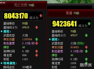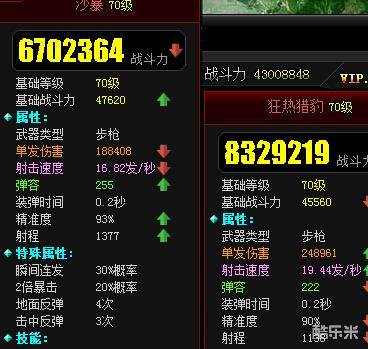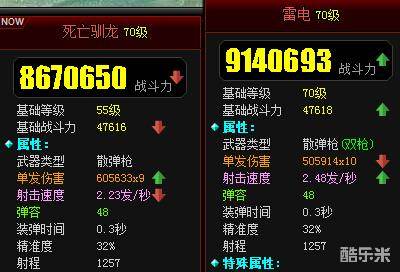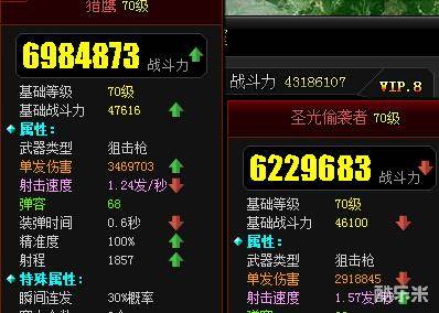 9、堆战力的武器选择依旧是新、老版竞技手枪+轰锤、雷电赤龙或野手枪,如果你的野手枪比赤龙、雷电还低,说明你的野手枪不够高战。玩家之间对比极品手枪的方法是:把70野手枪装上66零件放在躶体队友上,凡是超过62W的,用对了套装一定比赤龙雷电战力高。