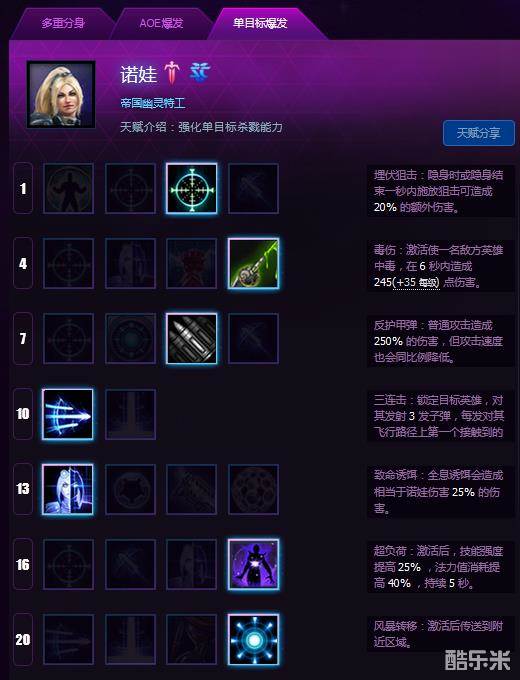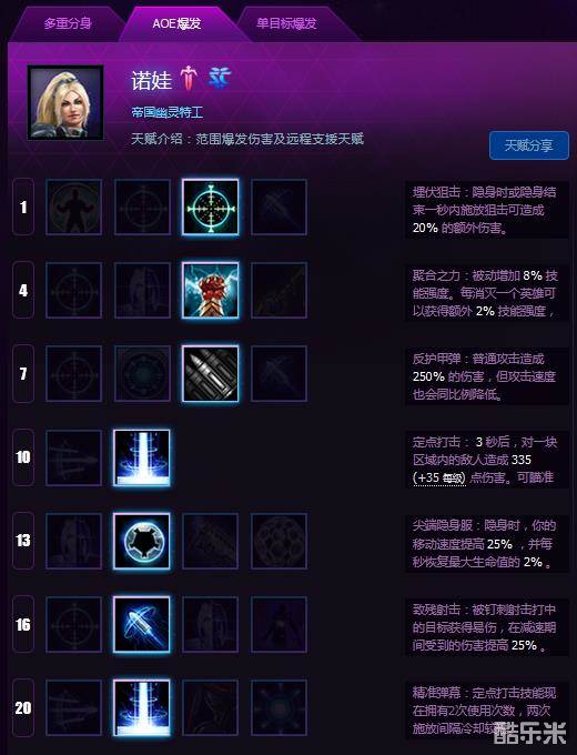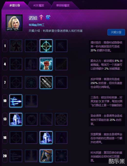 风暴英雄诺娃天赋加点分享,诺娃具有非常强的技能爆发能力和潜伏能力,可以对敌方的脆皮英雄造成很大的威胁。诺娃的天赋一般分成单体爆发型的多重分身输出型,选择大招时如果多有狭窄地形则选“定点打击”,如果敌方多有脆皮英雄则选择三连击。