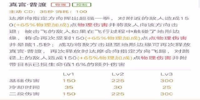 解析:三技能是达摩的核心技能,达摩对敌方英雄造成一定伤害并击退,如果敌方英雄触碰到地形边缘,将再受到一定物理伤害并眩晕,并且可以激活二段大招,达摩对路径上的敌方造成一定物理伤害并且附带目标已损生命值16%的额外伤害。想要成功激活达摩的二段大招玩家需要勤加练习,把握距离,该踢的时候就踢不要犹豫,值得一提的是,达摩在野区用大招成功率更高,现在达摩距离削弱了线上如果要踢的话一定要等敌方英雄站在地形边缘。