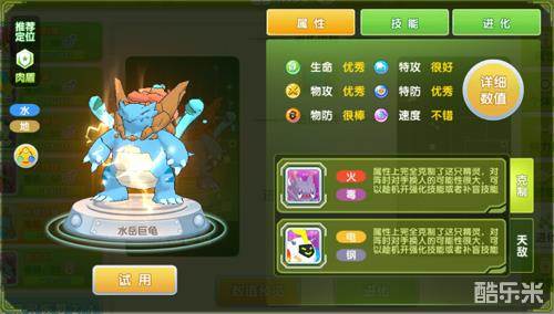 精灵定位:水系、地系,身高2米,体重300千克。水岳巨龟的精灵定位为肉盾,可以持续给奶回血加防御,给输出型的贝克梦提供更多的选择空间。技能推荐:回归大地,战斗时有50%~100%概率无视本回合所有的能力变化。水循环,免疫水系技能,10%~100%回复5%的最大生命。