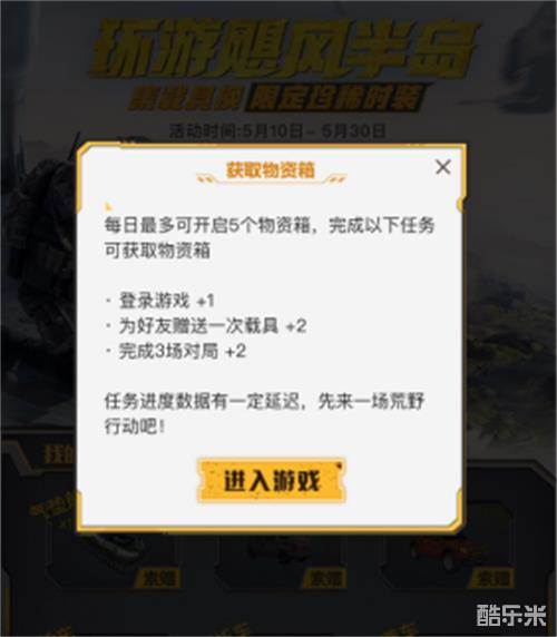 玩家可以通过登录游戏、完成3场对局、为好友赠送载具等三种方式获取物资箱。玩家每日可最多开启5个物资箱。每日的任务进度和获取的载具次数会在次日0点清空。当天完成任务所获得的物资箱将自动加入未开启次数中,不会被清空。