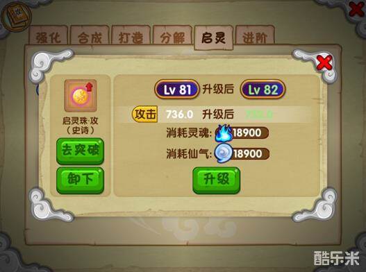 4、分解装备:在主界面的云中子处(炼丹炉)的分解界面,可以对装备进行分解,分解后可以获得一定量的仙气,值得注意的是,只有品质在蓝色及蓝色以上的装备才能进行分解哦!