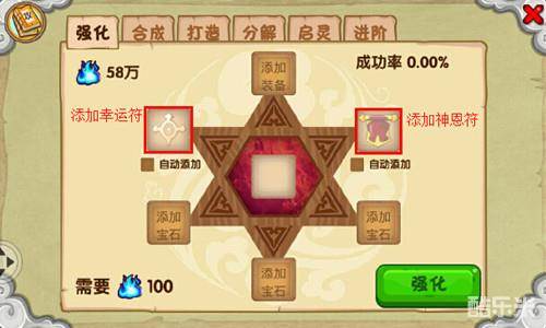 PS:强化装备需要添加幸运符和神恩符。添加幸运符,可以提高强化成功几率;添加神恩符,防止高级装备强化失败降级。