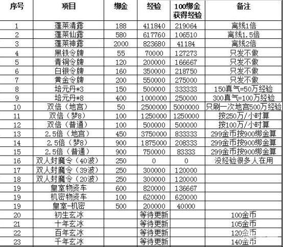 1、常用换经验道具,每100绑金获得经验由多到少是培元丹*3--黄金令牌--培元丹*8-蓬莱清露-白银令牌-青铜令牌-黑铁令牌-蓬莱仙露-蓬莱神露。那么最高的经验道具是中级炼气(培元丹*3 150绑金)