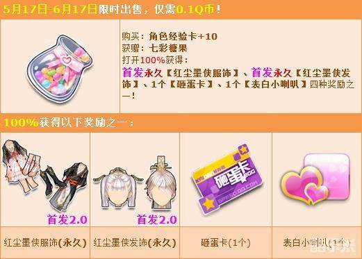 5月17日-6月17日期间,购买:角色经验卡+10,获赠:七彩糖果,打开100%获得:首发永久【红尘墨侠服饰】、首发永久【红尘墨侠发饰】、1个【砸蛋卡】、1个【表白小喇叭】四种奖励之一!,千万不要错过哦!