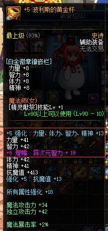 左右槽的强化、增幅提升是很明显的。和防具不同,左右槽会随着增幅和强化而提升四维。从数据层面看,一个90级的史诗左右槽是26点四维,而一个增幅5的左右槽连上本身却能带来31点四维的提升。那么增幅5需要多少金币呢?充其量也就是几百万罢了。这个时候增幅明显要比强化稳得多了。