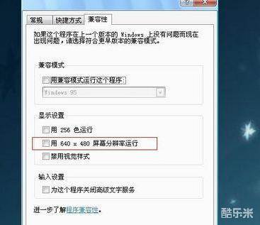 在打开快捷方式的属性页面后,大家进入到平时大家输入参数去鼠标加速的页面。然后在最上面大家可以看到,常规,快捷方式,兼容性这三个栏。那么我们点开兼容性,在下面的显示设置里有一个选项,用640*480屏幕分辨率运行,是的在这个选项前面打勾,确定,OK,搞定。然后大家再freq100就会变为全屏了。