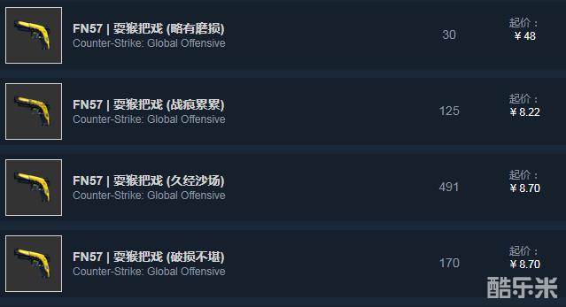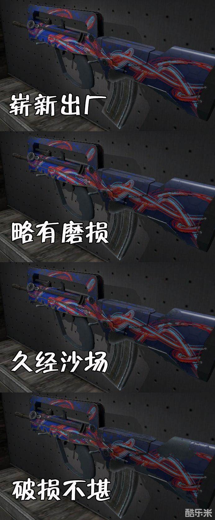 耍猴把戏也是款卡磨损的皮肤,磨损区间为0.10<耍猴把戏<0.90。但不太吃磨损,久经沙场中就能挑选到不错的外观。甚至不太挑剔的玩家,连低磨损破损不堪也可以接受。