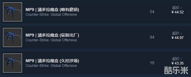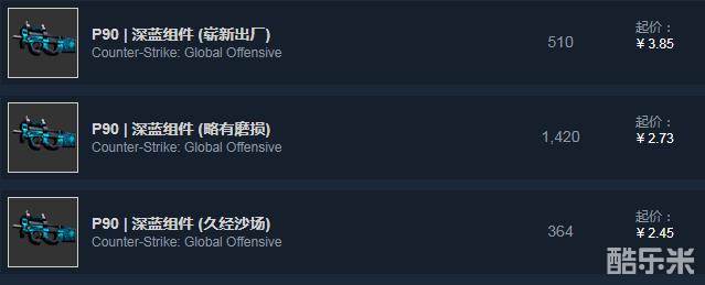 深蓝组件算是一款冷门P90皮肤,尽管不贵,但平时出场几率也不高。因为论便宜比不过精英之作和冷血无情……而不吃磨损的特点也让深蓝组件不同磨损价格差距很小,崭新才4块钱,略磨、久经2.5元左右。所以还是那句话,随便选。