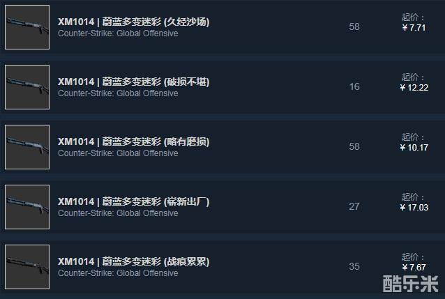 蔚蓝多变迷彩是死亡游乐园收藏品,只有在大行动期间并且购买大行动通行证才可以掉落。所以价格在XM1014皮肤中不便宜的,不过它的价格可不是它自身价值的体现。因为10把蔚蓝多变迷彩可以合成USP|公路杀手或AWP|森林DDPAT(概率各50%),所以蔚蓝多变迷彩的价格随之浮动。其实崭新和略磨价格相差不大,买低磨崭新最佳。
