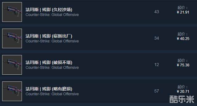 法玛斯是冷门枪,而残影则是冷门枪中的冷门皮肤,出厂几率微乎其微。但是它的价格也一点也不便宜,身为保密品质崭新竟然有40块,而比它品质高一等级的主战枪M4A4|X光价格也不过64块钱。说明残影在美学方面还是很可以的,从性价比看推荐略磨,反正崭新也不是完美外观。
