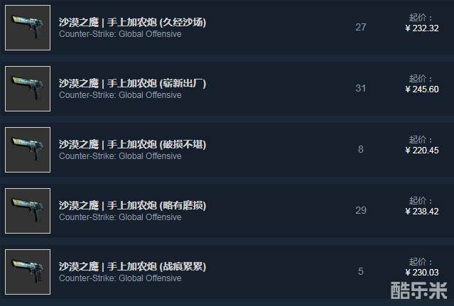 手上加农炮是古堡受限品质收藏品,只有在大行动期间并且购买大行动通行证才可以掉落。说起古堡大家就会想起龙狙,10把骑士必出龙狙,10把手上加农炮必出骑士。所以手上加农炮的价格怎会低呢?不过由于是0.01磨损起,所以若用来做合成素材,相比CZ75|复古圣杯磨损0起可是逊色不少。但沙鹰可是最热门的手枪(不管能不能杀人),所以价格在220——250元之间,外观来说没什么区别,可以随意选择。
